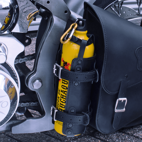 Lightweight aluminum bottle with key ring and swivel hook gives you 1.5 Liter (.33 Imperial Gallon or .396 US Gallon) space for drinks. Unbreakable and to good looking to pollute your camping site. Easily fits in a saddle bag or backpack. Or go for this the bottle with a Texas Leather real leather drink bottle holder that straps easily to your bike. Also easy to strap to one of the Texas Leather bags with fitted mounting straps. By the way, “Chuchaqui” means hangover. Note: Do not use this bottle for fuel.